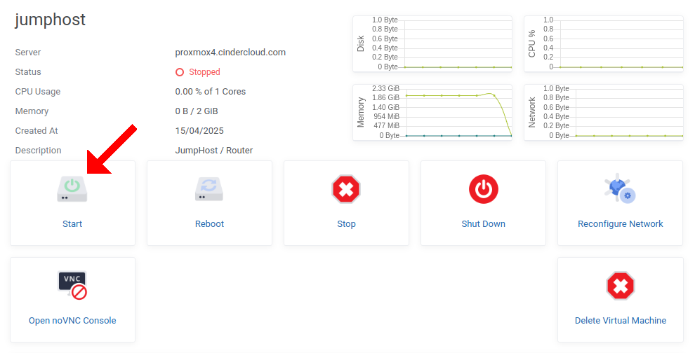 On the Product Details page of the JumpHost VM, click on the Start tile to start the VM: